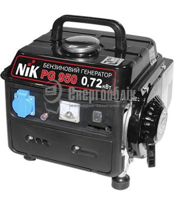 Головна перевага бензинового генератора NIK PG 950 - це мале споживання бензину (всього 4 л на 6 годин роботи). Невисокий рівень шуму (68 дБ) допускає установку генератора поблизу від спальних місць. Бензиновий двигун з ручним запуском дозволяє заводити генератор при низьких температурах, а низька ціна робить його доступним всім. Для двотактного двигуна слід готувати суміш бензину з маслом (50: 1) до заправки.